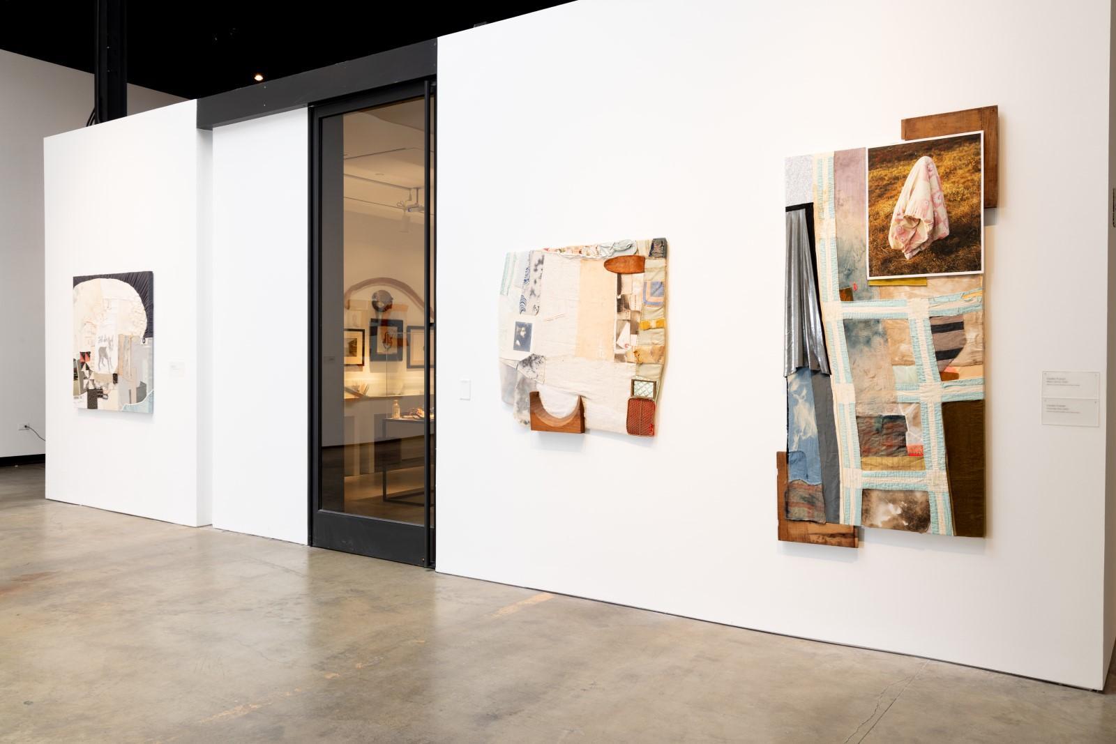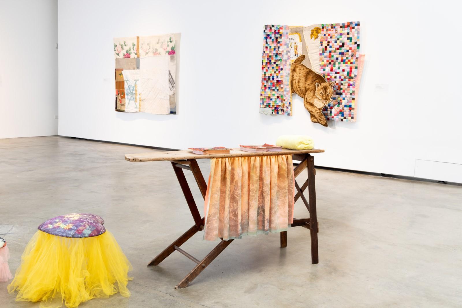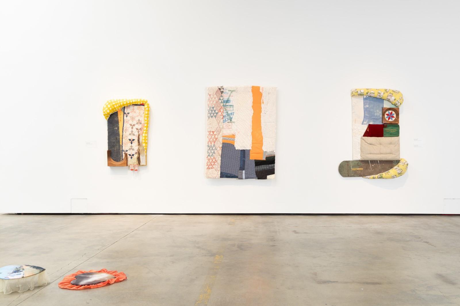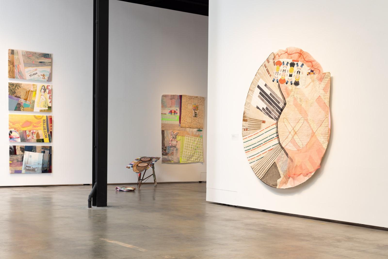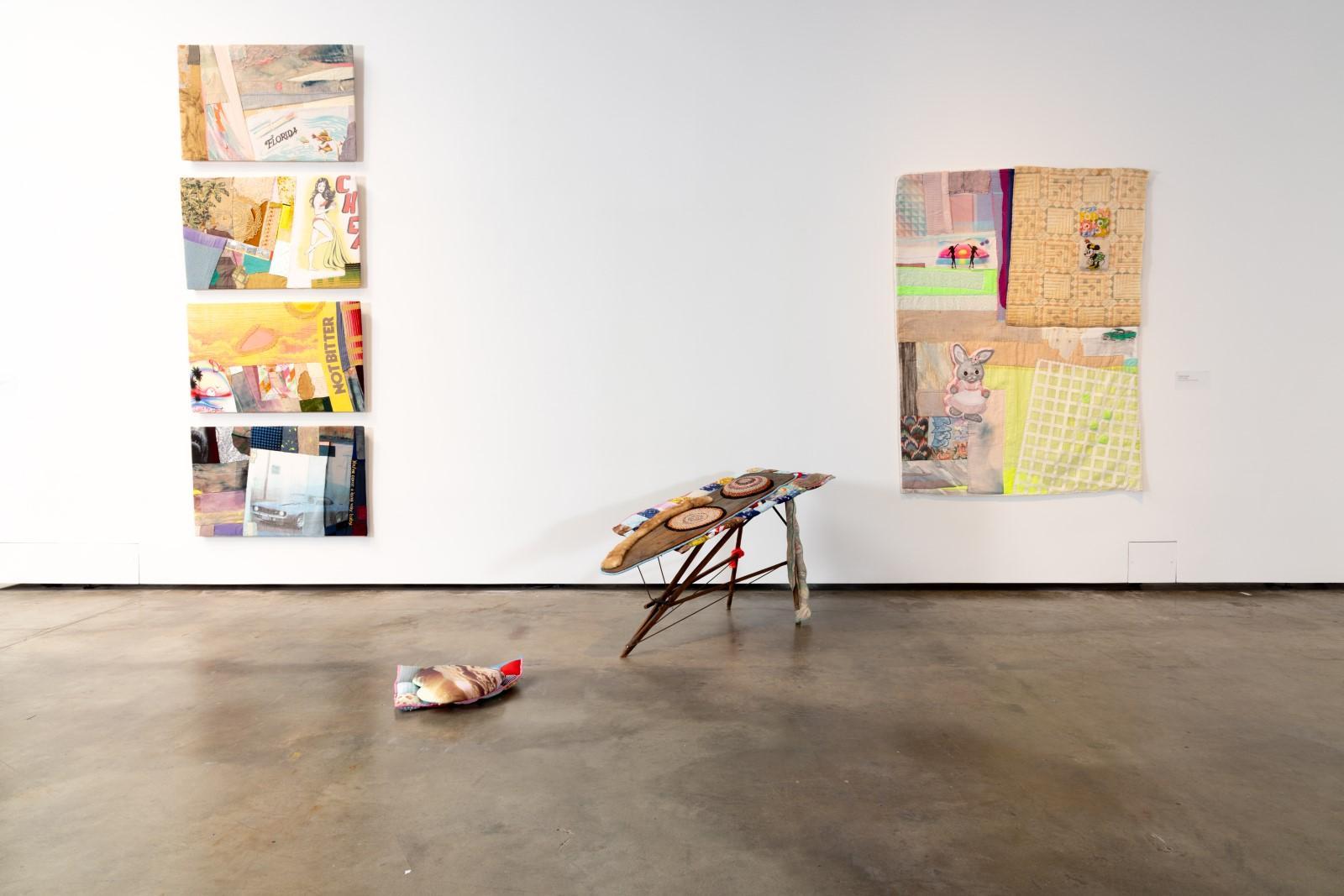 The quilted wall works and sculptures of the exhibition act as open-ended narrative