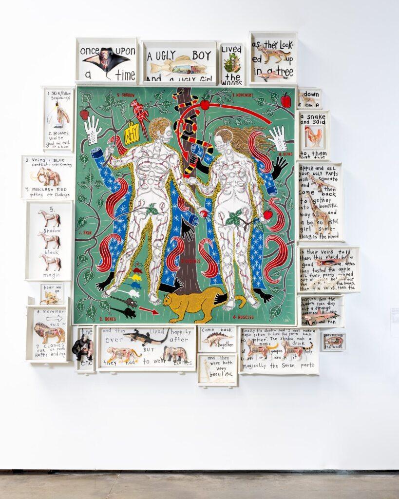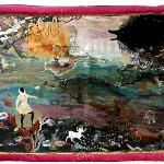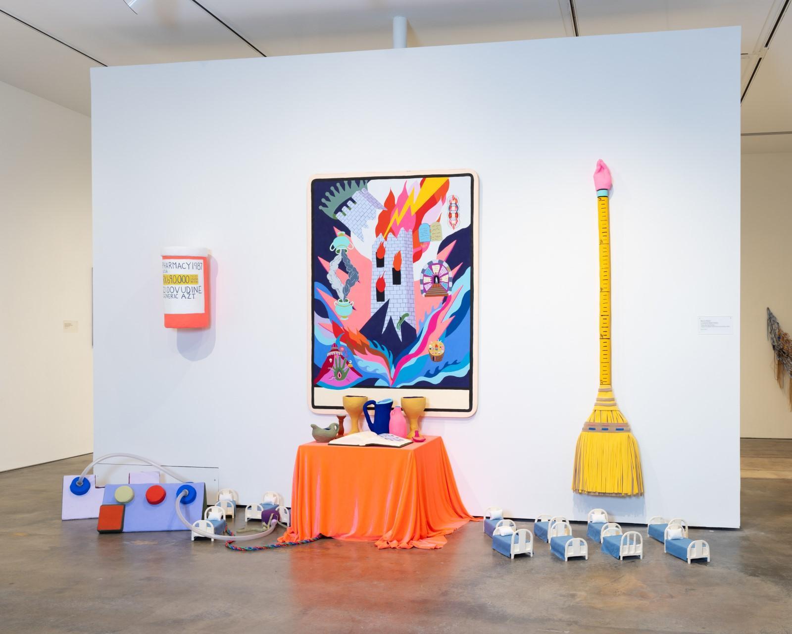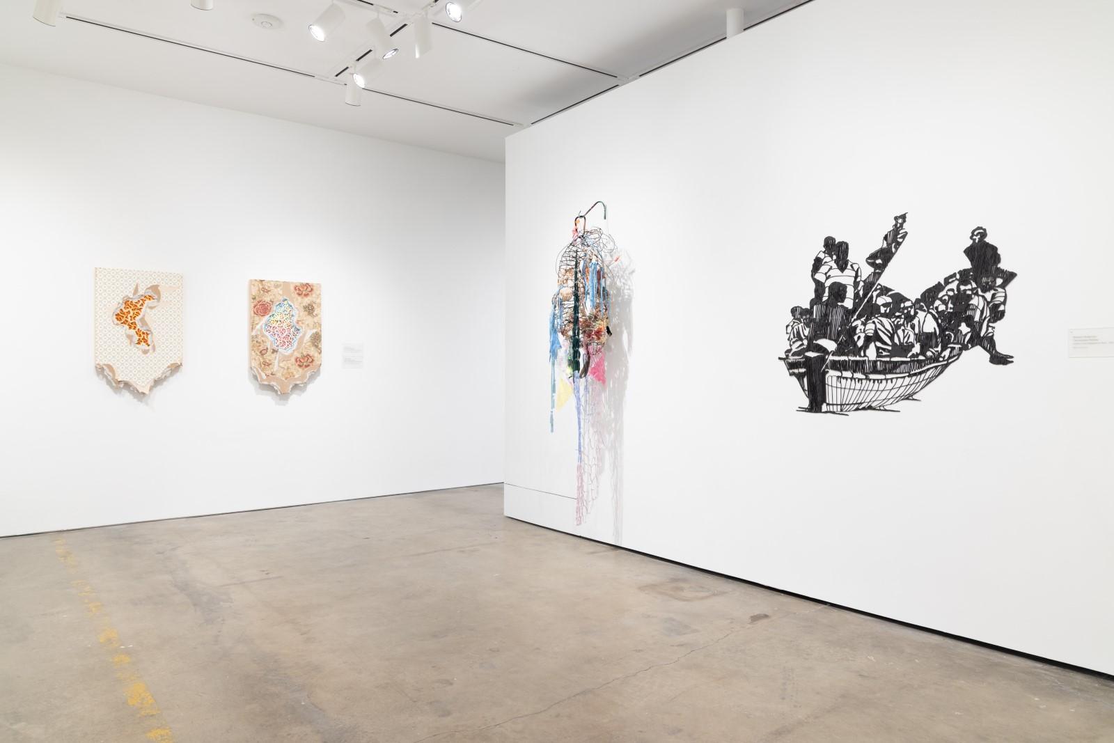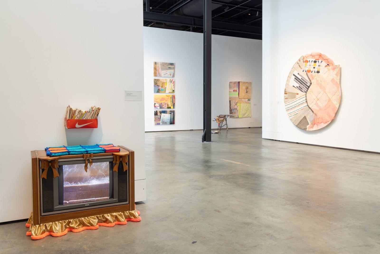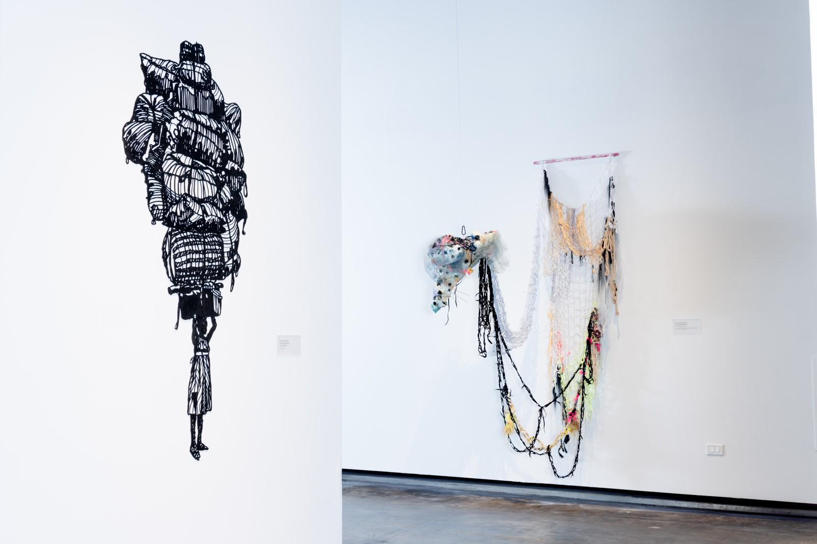 The quilted wall works and sculptures of the exhibition act as open-ended narrative