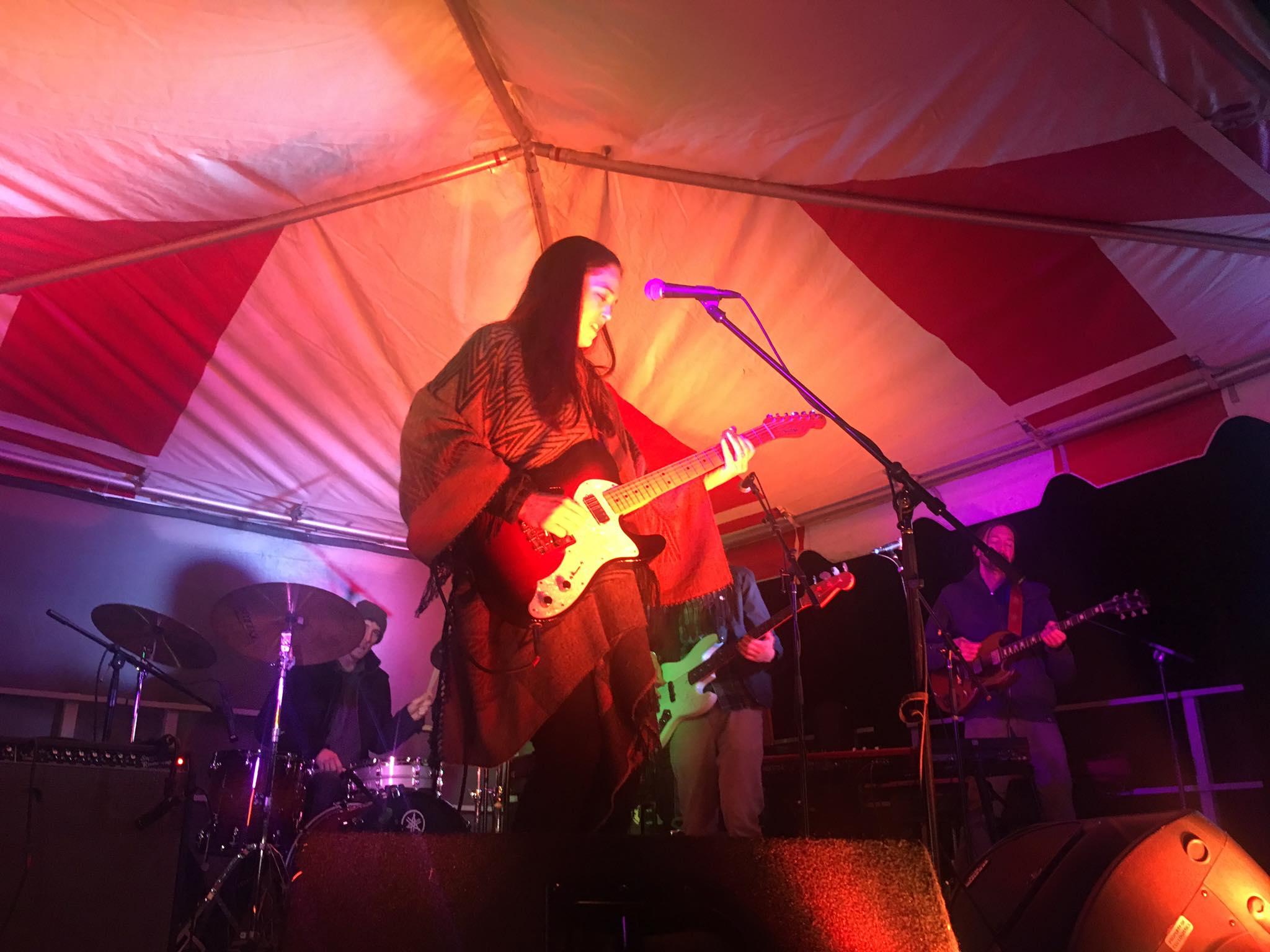 • Live band performance on a colorfully decorated stage, with a guitarist playing an electric guitar under warm stage lighting.