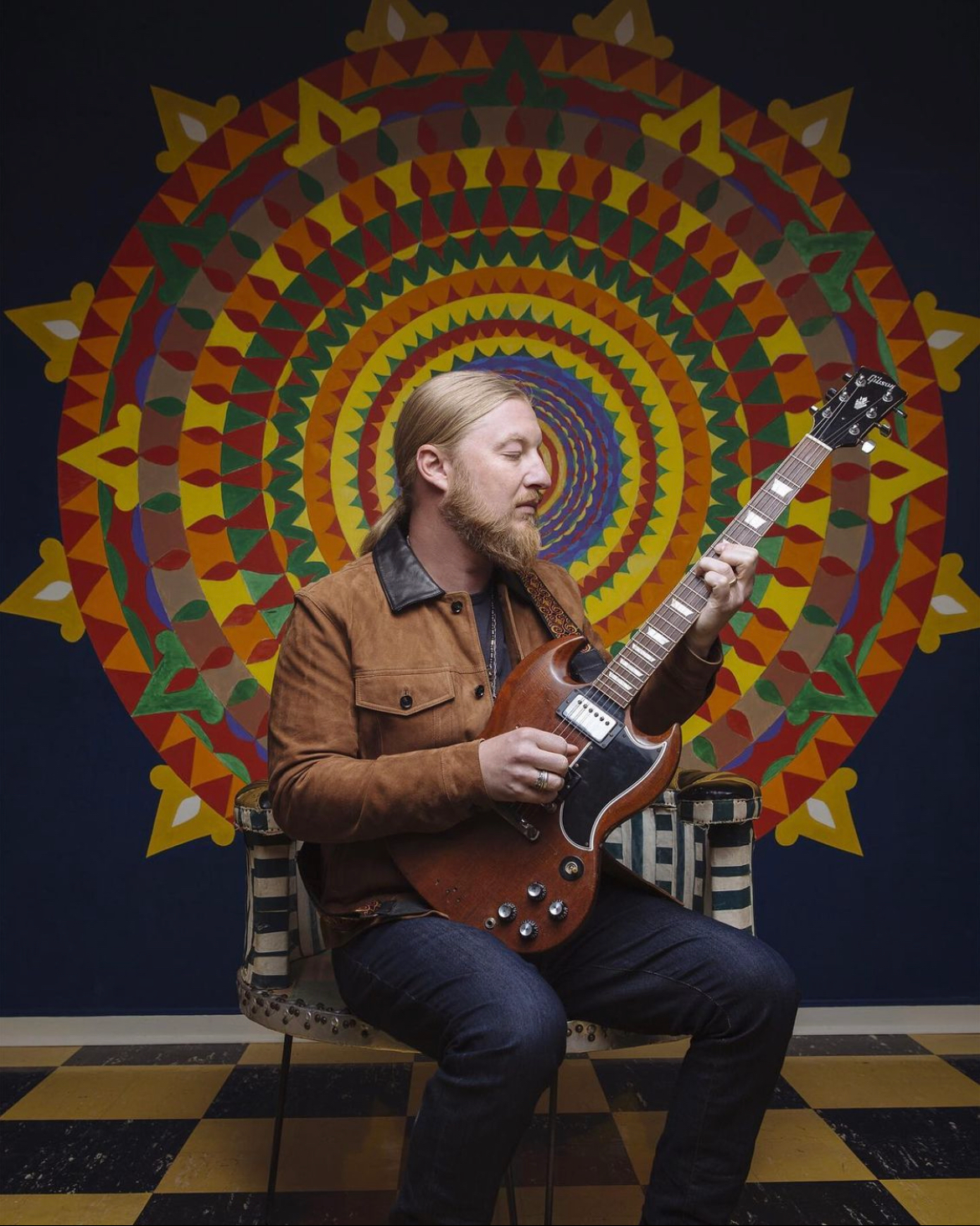 • Guitarist kneeling while playing an electric guitar in front of a large colorful mandala-style mural.